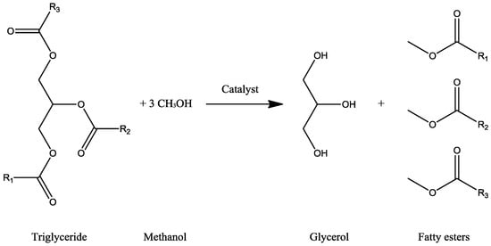 The transesterification reaction of the beaver oil with ethanol to produce glycerol was conducted in 1864 by Rochieder [,]. Figure 7 represents the schematic of the reaction, where methyl-esters from triglyceride (oils) and methanol (alcohol) react to produce glycerol and fatty esters (or biodiesel) [,,].