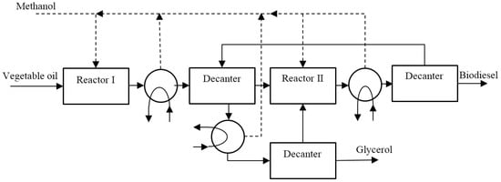 The block diagram of triglycerides trans-esterification with heterogeneous catalysts (mainly aluminium and zinc oxides) is reported in Figure 9. To increase the vegetable oil conversion, the process foresees two reaction steps; the first reactor is fed by vegetable oil and methanol. The product stream passes through a heat exchanger to evaporate part of the unreacted methanol, while the remaining stream is sent to a decanter to separate polar (largely glycerol) and non-polar (most vegetable oil and biodiesel) components. In the second reactor, the non-polar stream is reacted for the 2nd time to increase the production of biodiesel and recover the methanol. The product stream passes through the heat exchanger, which removes the entire unreacted methanol, while the decanter separates the biodiesel from polar components. The polar streams of both the first and second polar decanters are sent to another heat exchanger for recovering the remaining methanol present in the mixture, while the residual part is sent into a final decanter for the separation of vegetable oil and unreacted glycerol.