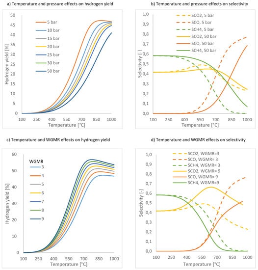 Thermodynamic analysis about GSR reaction performance in terms of hydrogen yield and selectivity: effect of pressure, temperature and water/glycerol molar ratio (WGMR). (a) temperature and pressure effects on hydrogen yield; (b) temperature and pressure effects on hydrogen selectivity; (c) temperature and WGSMR effects on hydrogen yield; (d) temperature and WGSMR effects on selectivity.