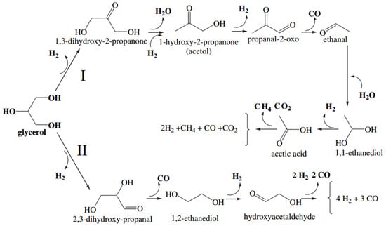 Regarding the utilization of Pt-based catalyst in GSR reaction, Pompeo et al. [] described an interesting mechanism, represented schematically in Figure 11. The mechanism involves two paths: the first pathway (I) consists of a dehydrogenation of glycerol with subsequent dehydration to form acetol; a second dehydrogenation, with a first breaking of C–C bond and subsequent formation of acetic acid (caused by a dehydrogenation and cleavage of the C–C bond). Then, the acetic acid decomposes into CO2 and H2. The second pathway [II] does not involve dehydration reactions, but mainly cleavage of C–C bonds and dehydrogenations, producing H2 and CO. The same mechanism has been proposed for Ni-based catalyst [].