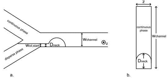 (a) Outline of the quantities defined in the second-to-last frame before droplet detachment and (b) cross-section of the downstream channel with the oil neck. In both images, the dimensions and the angle are not to scale. Reprinted with permissions from []. Steegmans, M.L.J.; Warmerdam, A.; Schroën, K.G.P.H.; Boom, R.M. Dynamic interfacial tension measurements with microfluidic Y-junctions. Langmuir 2009, 25, 9751–9758. Copyright 2009 American Chemical Society.