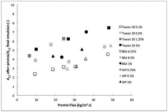 Whey protein (WP), BSA, and Tween 20 at different concentrations were employed to obtain 10% (w/w) hexadecane/water emulsions. A coarse emulsion was produced using rotor stator mixing and then this coarse emulsion was passed through a membrane. Since the starting emulsions did not have the same size (measured values are given in Supplementary Materials, Table S1), we here compare the results based on the reduction in size that was achieved (Dafter premix/Dfinal), as illustrated in Figure 3 for different premix fluxes.