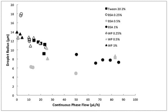 Radius of hexadecane droplets versus continuous phase flow in Y-junctions using Tween 20, BSA, or whey protein at different concentrations.