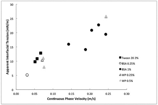 Even more surprisingly, the values found for the simple surfactant Tween 20, seemed to be higher than for protein at the same continuous phase flow velocity, while the equilibrium interfacial tensions measured in a volume droplet tensiometer was much lower for Tween 20 than for any of the proteins. This is only possible if the protein has different properties in a shear situation compared to a diffusion situation as used in the droplet volume tensiometer (fully diffusion based, and equilibrium conditions). The unexpected low values for proteins could indicate that they underwent conformational changes that affected their surface properties. Bos and van Vliet [] have pointed out that once proteins are absorbed, their conformation may change considerably at hydrophobic surfaces as present in O/W emulsions, and the conformational changes will depend on the nature of the protein. So-called flexible proteins (e.g., casein) are more easily deformed than so-called hard proteins, like BSA or whey proteins as employed in this study. In so called Lissajous plots, the dynamic shear thinning interfacial behavior of whey protein has been demonstrated, and this may also have contributed to the observed behavior [,].