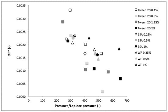 Relationship between the Oh* number and the pressure ratio for the premix membrane emulsification (ME) experiments with different concentrations of Tween 20, BSA and whey protein based on the apparent interfacial tension calculated from the Y-junction experiments.