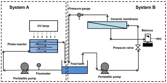 Schematic of a laboratory-scale photocatalysis (System A)/ceramic membrane system (System B).