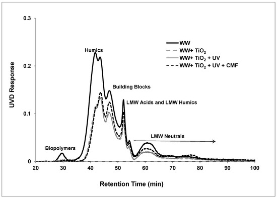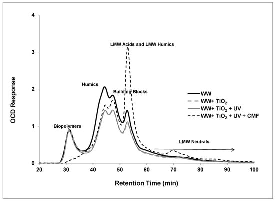 The chromatograms obtained with OC detection are shown in Figure 5. This technique allows the separation and assignment into different groups of organic components, particularly biopolymers (proteins, protein-like substances, polysaccharides), humic substances, building blocks (sub units of humic substances), low molecular weight acids (monoprotic organic acids) and low molecular weight neutrals (alcohols, aldehydes, ketones, amino acids). Figure 5 shows the evolution of LC-OCD chromatograms following different treatment as a function of retention time. These chromatograms provide better understanding of the effects of TiO2 adsorption without UV, the photocatalytic effect of TiO2/UV, and the hybrid system of photocatalysis and ceramic membrane filtration (CMF) on the secondary effluent. The first peak appeared at 29 min after sample injection and was assigned to the biopolymers with an approximate molecular weight (MW) greater than 20,000 Da. This was followed by humic substances with an MW of 1000–20,000 Da, building blocks with a MW of 300–500 Da, and low molecular weight acids of less than 350 Da at approximately 43, 46, and 52 min, respectively. The low molecular weight neutrals were detected at the end of the chromatogram between 55–100 min.