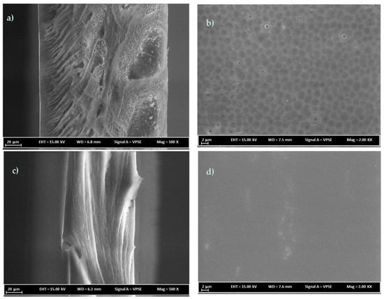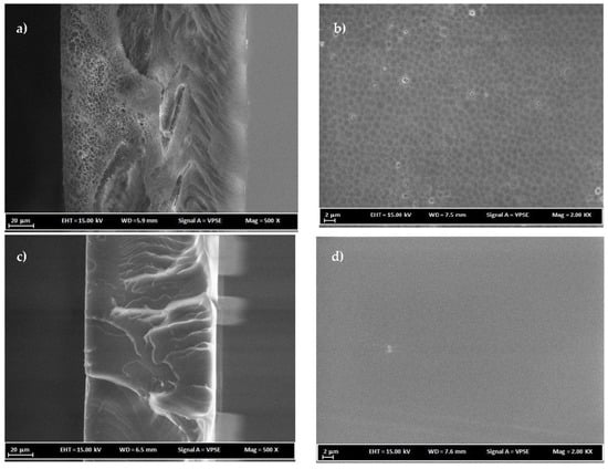 FESEM cross-sectional and surface images of membranes (a,b) 18 wt % PC/NMP and (c,d) 18 wt % PC/DCM.