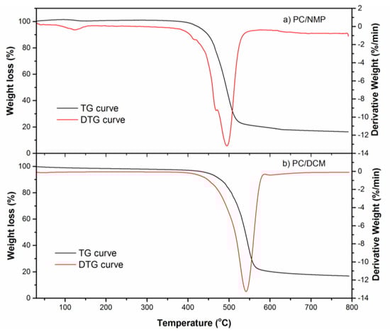 The thermal stability of the PC/NMP and PC/DCM membranes, i.e., degradation temperatures were investigated using TGA analysis. Further, the possible presence of residual solvent in the polymer matrix was also studied using TGA curves. This is because the residual solvents can potentially interact with the polymer matrix which may further lead to a negative contribution to the overall performance and strength of the membranes. It affects the permeation behavior by blocking the sorption site and decreasing the free volume of the polymer membrane matrix [35].