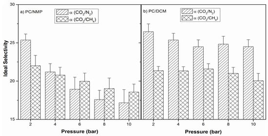 Ideal selectivity of PC membranes prepared (a) 18 wt % PC/NMP and (b) 18 wt % PC/DCM.