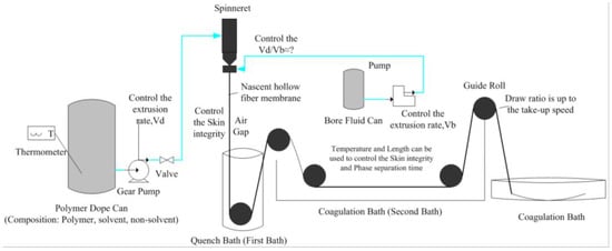CA hollow fiber membranes were spun using the well-known dry-jet wet spinning process [,]. The dope solution consisted of CA, NMP, and the additive PVP (used to increase the porosity of the carbon membrane). A schematic diagram for the spinning process is shown in Figure 1. The extrusion rate for dope and bore fluid were controlled by two gear pumps, respectively. A double spinneret (ID/OD, 0.5/0.7 mm) was used in this study with the aim of spinning defect-free hollow fibers by controlling the spinning parameters. In order to systematically investigate the effects of spinning parameters and reduce the experimental times, an orthogonal experimental design (OED) method together with multivariate analysis was introduced to optimize the spinning conditions. The factors and levels for the OED are given in Table 1, and Statistical Product and Service Solutions (SPSS) software was used to generate the experimental plan.