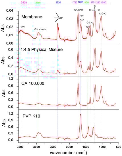Fourier transform infrared spectroscopy (FTIR) spectra of cellulose acetate (CA) and polyvinylpyrrolidone (PVP), 1:4.5 Physical Mixture (CA and PVP power mixed) and Membrane (spun CA/PVP hollow fibers).