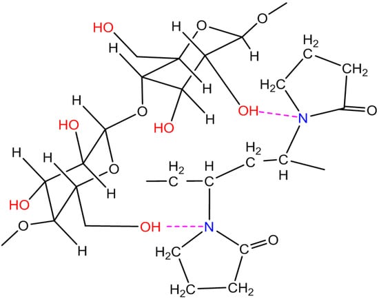 The FTIR spectra of the pure CA, the pure PVP, the physical mixture of CA and PVP, and spun hollow fiber membrane were shown in Figure 2. The characteristic adsorption peaks of 1030 cm−1, 1230 cm−1, and 1740 cm−1 are attributed to the ether group (), acetyl ester group (), and carbonyl group () of CA, respectively. The peak at 1665 cm−1 is attributed to the carbonyl group in the PVP. Moreover, the assumption that an additional hydrogen bond may form between the CA and tertiary amide group of PVP is possible because the IR spectrum displays a strong absorption band in the region of 2250–2700 cm−1 that is characteristic of hydrogen bond for tertiary amide [], as illustrated in Figure 3.