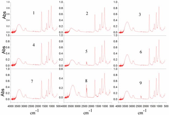 FTIR spectra of the spun hollow fiber membranes for the experiment plan, which were shown in Table 2.