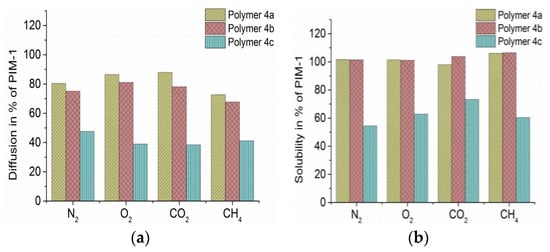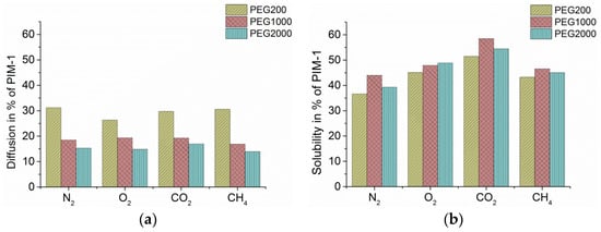 In Figure 1 are shown diffusivity (Figure 1a) and solubility coefficients (Figure 1b) of three blended membranes (ca. 10 wt % of the three different PEGs) calculated from time lag experiments (see Supplementary Materials S2) and set in relation to the pristine PIM-1 (=100%). As expected, the solubility of CO2 is reduced less compared to O2, N2, and CH4 (Figure 1b). It is known that enhanced solubility is the reason for the high flux of CO2 in PIM-1 and other polymers [], and also in PEGs [] while N2 has a low solubility in PIM-1 as well as in PEGs. Therefore, selectivity of CO2 over N2 increased up to a value of 30 at 10 wt % PEG content. The chain length of the PEGs affected solubility only slightly but with PEG-1000 in favor.