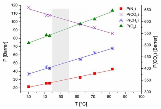 PIM-1 + 11 wt% PEG-2000: Permeability of four different gases at temperatures up to 80 °C. Colored in grey is the melting region prospected for PEG-2000.