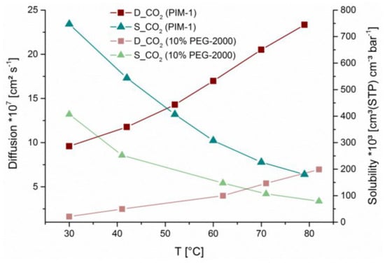 Because of the clearly different behavior of CO2 from the other measured gases, in Figure 3 diffusion and solubility of CO2 in pristine PIM-1 and PIM-1 blended by 11% PEG-2000 versus temperature are compared. Solubility of CO2 (Figure 3, left side, triangles) in blended PIM-1 membrane (pale triangles) decreased exponentially from a high level and very similar compared to PIM-1 (dark triangles), at 80 °C only 20% of the solubility coefficient at 30 °C is left. According to the low degree of crystallinity, diffusivity of CO2 could be described by exponential curves too (Figure 3, right side, squares). The increase in diffusivity from 30 to 80 °C is about 2.5 times for PIM-1 (dark squares) and 4 times for the blended membrane (pale squares) involving the pronounced miscibility of PIM-1 and PEG-2000 at higher temperature. The other three gases, measured but not depicted, showed a similar behavior in diffusion as well as a decrease in solubility but on a much lower level.