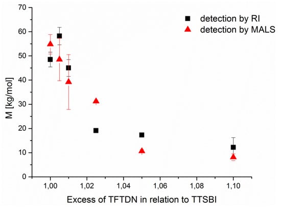 Molecular weight of PIM-1 prepared by polycondensation with excess of 2 above 1. Reaction conditions: K2CO3 (2.04 molar towards 1), 3 h at 55 °C in DMF. SEC measurements detected by RI (squares) and MALS (triangles).