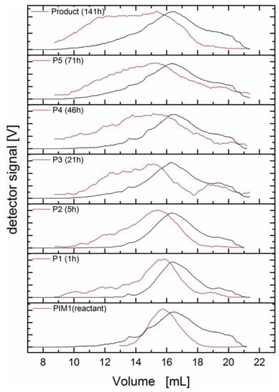 In Figure 6 are depicted typical SEC measurements of samples taken during an extended poly-condensation resulting finally in PIM(25)-b-PEO(2) with rather high molecular weight. These samples were prepared by precipitation in water and worked up either by extraction with CHCl3 (samples from the start) or by direct filtration. All samples were measured in SEC (liquid phase CHCl3). Black lines show the eluted volumes, differentiated by reaction time and detected by RI, the red lines were results of MALS detection. The black line at the bottom of Figure 6 (PIM-1 reactant) represents the starting PIM-1 sample with F-end groups and approximately 20–25 kg/mol with a broad peak at 16–17 mL eluted volume. Monomer PEG-2000-di-DHBA-ester (5c) was added and after 60 min the next black line was measured. During progress of reaction the initial PIM-1 peak broadened towards lower elution volume (=higher molecular weights). Additional samples were drawn after 10 h, 45 h and 75 h of reaction time. Finally, the product is represented by the black line on top of Figure 6. Distribution of molecular weights is very broad. The final Mw measured by RI detection was calculated by universal calibration (polystyrene (PS)) standards to average 380 kg/mol with quite large deviations. However, a basic problem with RI detection is the universal calibration by polystyrene standards. The contorted structure of PIM-1 (and the similar polymers in our study), introduced by the spiro-formation of 1, is the reason for the apparent intrinsic microporosity by hindering the polymer chains to pack efficiently and thus forming molecular nano-sized pores in between the chains. As the product of a polycondensation reaction, PIM-1 shows a rather broad mixture of different chain lengths (PDI >> 1), therefore many deviations towards higher and also lower molecular weights. Average molecular weight of polymers is usually estimated by SEC on calibrated separation columns and in most SEC labs the universal calibration by commercial available PS standards and detection by refraction index (RI) and/or UV signals is the acknowledged standard method. Separation on SEC columns also depends on the hydrodynamic volume of the polymers and PIM-1 with its contorted structure is quite different from PS. Therefore, this standard method provides not always reliable molecular weight values. However, from SEC measurements at different concentrations and detection by RI the determination of the refractive index (RI) increment dn/dc is available comparing the deviation from respective PS standards. Using the dn/dc value measured for the employed polymers, it is possible to detect also by Multi Angle Light Scattering (MALS) (method see for example []) and to achieve more reliable molecular weight values for PIM-1 and the structural variations that are described in this study.