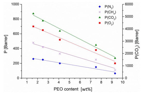 By differentiating permeability in diffusivity and solubility, it was shown that addition of PEG/PEO/PPO affected diffusivity of all measured gases quite uniformly. Solubility of CO2, O2, and CH4, however, was reduced less than solubility of N2 resulting in increased selectivity for the former gases. Concentration optimum for the combination of PIM-1 and PEO between gaining solubility for selected gases and losing not too much permeability for all gases under consideration is in the range of 2–5 wt % PEO.