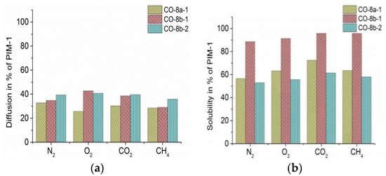 Diffusivity (a); and solubility coefficients (b) of polymers PIM-CO-8, calculated from time lag measurements at 30 °C and in relation to pristine PIM-1 membrane (in Table 2).