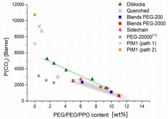 In our study, we followed four different paths to combine PIM-1 and PEG or PEO. First, we also blended PIM-1 with PEGs of different molecular weights to evaluate the optimum amount of PEG and to check on the influence of PEG chain length. Long PEO chains are favorable for CO2 solubility [] but tend to crystallize and separate from PIM-1 phase. Therefore, we favored PEGs with smaller chain lengths of ≤5 kg/mol. The permeability of blended membranes should not be reduced too much; the influence of the added PEGs on solubility of CO2 and other gases is going to be estimated. A similar approach was followed in [,] by blending PEBAX® (Arkema, France) with PEGs in different amounts, although in these cases it was thought as an attempt to increase the rather low pristine permeability of the block copolymer.