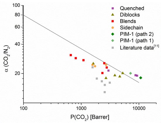In Figure 10 is depicted exemplarily a section from Robeson’s plot (the “upper bound” of 2008 [] represented by the black line) for selectivity of CO2/N2 versus permeability of CO2 at 30 °C. Included are only PIM-1 values from our study, one of them is above the upper bound, one below. Permeability of our PIM-1–PEO combinations is reduced compared to the pristine PIM-1 and therefore, following Robeson’s trade-off, an increase in selectivity for CO2/N2 distinctively above 20 is achieved in most cases, however, by relinquishing a considerable part of permeability (Figure 9). Diagrams made up for CO2/CH4 (increase in selectivity from 10 up to 14–18), or O2/N2 (increase in selectivity from 2.8 up to 3.5) (neither shown) provide identical information but on a much lower (as well permeability as selectivity) level.
