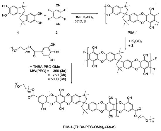 Preparation of PIM-1-(THBA-PEG-OMe)2 polymers (4a–c) by termination of PIM-1 polycondensation with THBA-PEG-OMe (3a–c).