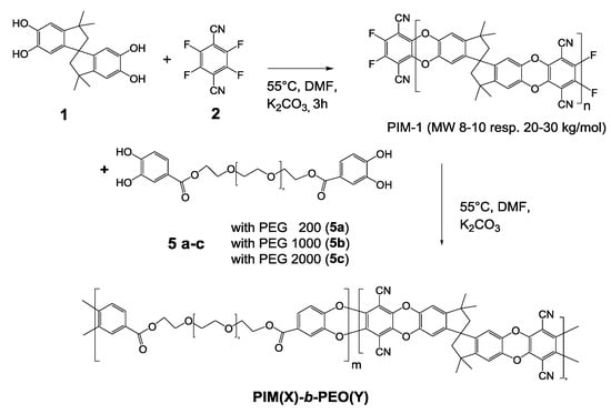 Preparation of PIM(X)-b-PEO(Y) multiblock copolymers in two reaction steps. Step 1: polycondensation with excess of 2 over 1 to achieve low molecular PIM-1 (1.1:1 = 8–10 kg/mol, and 1.025:1 = 20–30 kg/mol); and Step 2: polycondensation with DHBA-di-esters 5a–c.