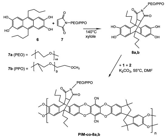 Within the fourth path, PEO were built in as side chains to the PIM-1 main chain by copolymerization with PEO substituted anthracene based maleimides. The synthesis of these maleimides followed the procedure published in []. The roof shaped tetrahydroxy-anthracene monomers were employed in polycondensation reaction together with the PIM-1 antecessors.