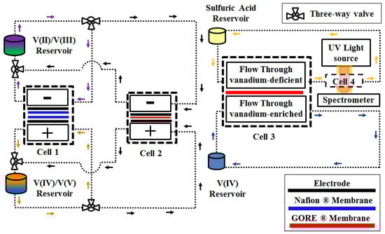 The electrolytes used for VRFBs exhibit strong visible light absorbance. Therefore, UV-Vis spectroscopy can be utilized to assess the composition of the solution. In this work, the spectrophotometric measurements were made using spectrometers in a transmission configuration with a spectral range from 400 to 900 nm. Since the focus of this work is to assess the permeability of V(IV), electrolyte absorbance was measured at a 760-nm wavelength [15]. Such measurements allowed the application of the Beer–Lambert law to determine the relative concentration of V(IV) [15]. To obtain the spectra associated with the vanadium-deficient solution, real-time spectrophotometry was performed while the solution of the vanadium-deficient side was circulating through Cell 4, as shown in Figure S1 (see Supplemental Figure S1).