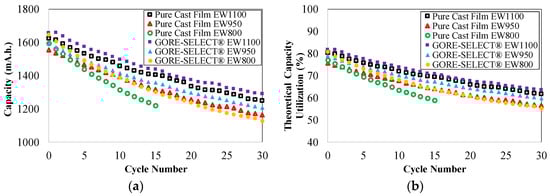 Figure 2a includes the discharge capacity as a function of cycle number for the first 30 cycles for different pure cast film and GORE-SELECT® membranes. In Figure 2a, the capacity decay data for the pure cast membrane with EW800 has only been reported for the first 15 cycles since the cell capacity became unstable due to membrane degradation. Figure 2b shows the theoretical capacity utilization for different membranes over the same duration. It is important to note that the theoretical capacity is determined using Cell 1 (from Figure 1) while charging the initial electrolyte; half of the total charge transferred to the electrolyte during the initial charge is evaluated as the theoretical capacity. Since both electrolytes were similar (1.5 mol/L V(IV) as VOSO4·xH2O (Alfa Aesar) dissolved in 3.3 mol/L H2SO4), half of the total initial charge corresponds to the full capacity window for an operating VRFB.