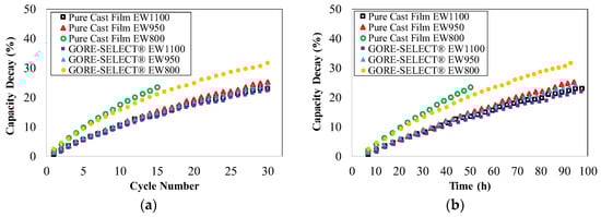 According to Figure 3a, the reinforced EW1100 membrane exhibits the lowest rate of capacity decay (~22% at the end of 30 cycles), and non-reinforced EW800 shows the highest rate of capacity decay (~24% at the end of just 15 cycles). It is important to note that, although the number of cycles for all of the experimental membranes was 30 (except non-reinforced EW800), the total cycling time for the different configurations varied due to different ohmic overpotentials imposed as a function of membrane conductivity. However, in general, cycling experiments were conducted over the course of approximately 100 h. Similar to Figure 3a, the reinforced membrane with EW1100 exhibits the lowest rate of capacity decay (~22% at the end of ~100 h), and non-reinforced EW800 results in the highest rate of capacity decay (~24% at the end of ~59 h) as a function of time.