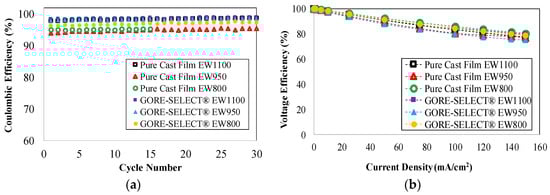 The main motivation of the present work is to better understand the effect of equivalent weight and reinforcement on overall cell performance, ionic species crossover, and capacity decay. In this work, we report the results based on VRFB cells that used GORE-SELECT® (Newark, DE, USA) or pure cast film membranes over a range of equivalent weight. Throughout this paper, “GORE-SELECT®” is conventionally used to indicate reinforced membranes, except in figures and tables where “GORE-SELECT®” has been used for labeling these types of ion-exchange membranes.