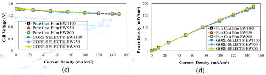 Furthermore, across all equivalent weights, reinforcement increased the ASR. Comparing the non-reinforced with reinforced membranes, for the EW1100 and EW950 sets, the ASR increases by ~18% due to membrane reinforcement, and for the EW800 pair, the increase in ASR is ~13%. In summary, the non-reinforced EW800 exhibits the lowest (0.15 Ω·cm2) and the reinforced EW1100 results in the highest value (0.28 Ω·cm2) of ASR.