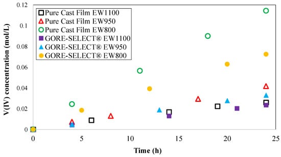 As shown in Figure 5, the concentrations of diffused V(IV) to the vanadium-deficient side differ as a function of membrane composition. The maximum concentration of diffused V(IV) at the end of a 24-h crossover test was measured for the non-reinforced membrane with EW800 (~0.114 mol·L−1), and the minimum concentration was achieved by reinforced membrane with EW1100 (~0.023 mol·L−1). The concentration of diffused vanadium V(IV) ions shown in Figure 5 can be used to obtain the permeability values for different membrane morphologies using the slope of a semi-natural log plot, formulated in Equation (7).