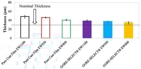 As shown in Figure 6, the nominal thickness for all membranes tested was 30 μm. However, expansion (degree of swelling) differed significantly as a function of membrane properties. As a general trend, for both non-reinforced and reinforced membranes, the expansion was greater for higher equivalent weights. For example, among the non-reinforced membranes, EW1100 exhibits ~62% expansion in the through-plane direction, and EW800 shows ~35%. However, the reinforced EW1100 membrane expanded by ~29%, and reinforced EW800 expanded by ~16.5%. As expected, the addition of reinforcement significantly decreases through-plane expansion. The quantitative details of the cation exchange membranes tested in this work are shown in Table 2.