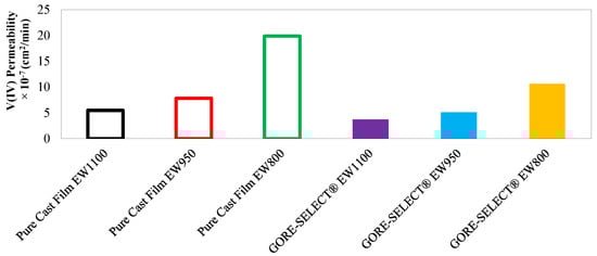 Figure 7 includes the resultant permeability values, based on the linear fits formulated in Equation (7). It is important to note that, for calculating the permeability values of V(IV) ions for each membrane, the thickness of the membranes equilibrated with the aqueous vanadium and sulfuric acid (as tabulated in Table 2) was utilized.