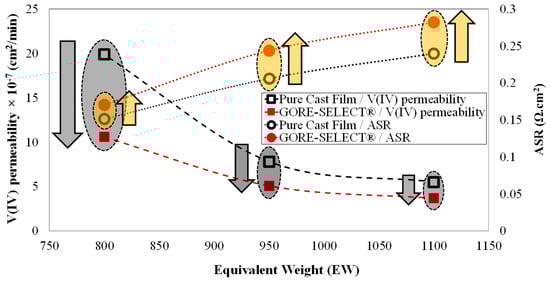 According to Figure 7, it is clear that, for both non-reinforced and reinforced membranes, increasing the equivalent weight decreases the V(IV) ion permeability. For non-reinforced membranes, decreasing the equivalent weight from 1100 down to 950 g·mol−1 increases the V(IV) permeability by 42%, and further decreasing the equivalent weight to 800 g·mol−1 results in 155% greater V(IV) permeability. In comparison, for reinforced membranes, decreasing the equivalent weight from 1100 down to 950 g·mol−1 increases the V(IV) permeability by 39%, and further decreasing the equivalent weight to 800 g·mol−1 further increases the V(IV) permeability by 109%.
