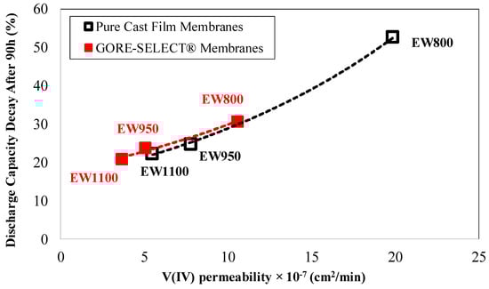 As is evident in Figure 9, there exists a strong correlation between the discharge capacity decay at the end of cycling with V(IV) permeability values. According to Figure 9, for non-reinforced membranes, increasing the equivalent weight from 800 to 950 g·mol−1, decreases the discharge capacity decay (after 90 h) from 53%–25% while decreasing the V(IV) permeability by 61%, and further increasing the equivalent weight to 1100 g·mol−1 decreases the discharge capacity decay to 22%, while the V(IV) permeability decreases by 30%.