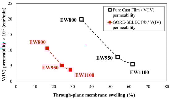 A physicochemical description of the two distinct trends observed in Figure 8 is also of interest. First, as shown in Figure 8, increased equivalent weight results in decreased V(IV) permeability for both pure cast film and reinforced membranes. A macroscopic mathematical model based on conservation of mass, charge, momentum, and energy along with a meso-scale model based on dissipative particle dynamics (DPD) has previously been used to assess vanadium ion crossover behavior due to a concentration gradient [15,37]. Based on the macroscopic model of vanadium ion transport through polymeric membranes, vanadium crossover under the concentration gradient can be best described by the diffusive transport parameter [15]. As included in Table 3, the diffusive transport parameter decreases with increased equivalent weight. With a concentration-gradient-induced driving force for vanadium ion crossover, increased equivalent weight results in greater membrane swelling (as shown in Figure 6), resulting in higher diffusion resistance via increased path-length for the transport of vanadium ions; accordingly, the diffusive transport parameter is decreased. A meso-scale model description of vanadium ion transport has also been formulated by others based on DPD simulations, and it shows that increasing equivalent weight results in a stronger vanadium-sulfonate bond and accordingly more structured configuration. The stronger anion-cation interaction (V(IV) and sulfonate) as a function of increased equivalent weight, thus results in decreased diffusivity of vanadium ions [37].