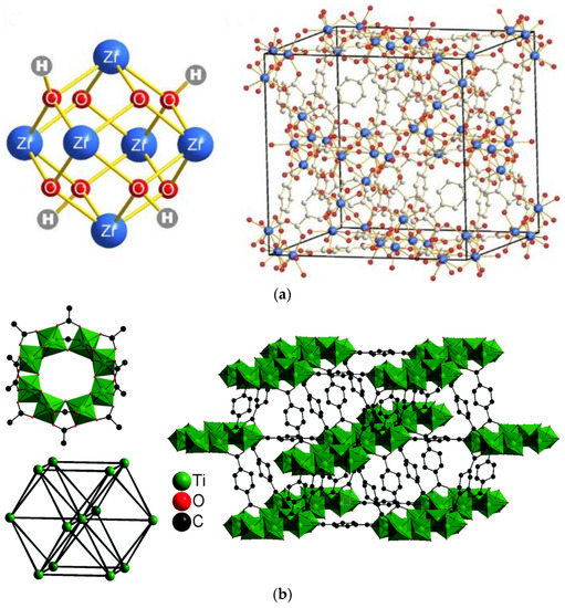 UiO-66 (MOFs based on zirconium) [59] and MIL-125 (MOFs based on titanium) [60] are water stable, carboxylate ligand–based MOFs [61]. The materials possess many metal atom centers, which give them high structural symmetry and steadiness. Figure 1 shows these structures as reported by Wang et al. [52] for UiO-66 and Devic and Serre for MIL-125 [62]. Properties including their high surface area, chemicals resistance, and functionalization ability made these MOFs good candidates for different applications [63,64].