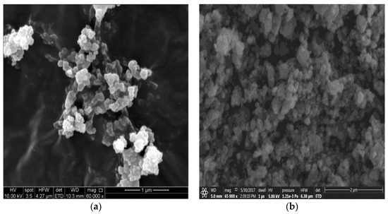 Scanning electron microscopy (SEM) images for (a) UiO-66 and (b) MIL-125 MOFs nanoparticles (NPs).