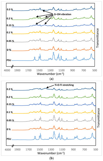 When MOFs NPs were added at very low amounts, new peaks corresponding to these NPs were not apparent. By increasing UiO-66 molar ratio to 0.15 and above, an obvious peak around 1380 cm−1 and a tiny one at 1565 cm−1 appeared, which could be assigned to the Zr-OH vibration [73,74,75,76], as shown in Figure 3a. At 0.3%, the peak disappeared; this might be caused by the particles’ aggregation so no proper NP dispersion was obtained. For MIL-125 at 0.3%, a clear peak was observed around 1416 cm−1, which could be assigned to the Ti–O–Ti stretching vibrations [77].