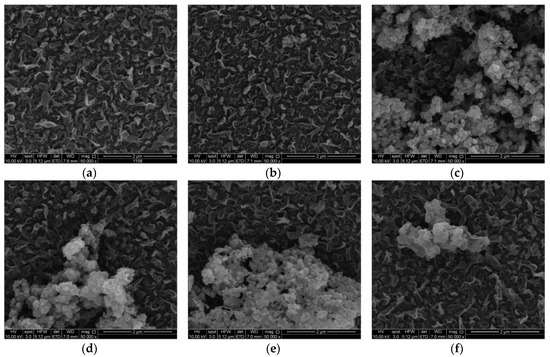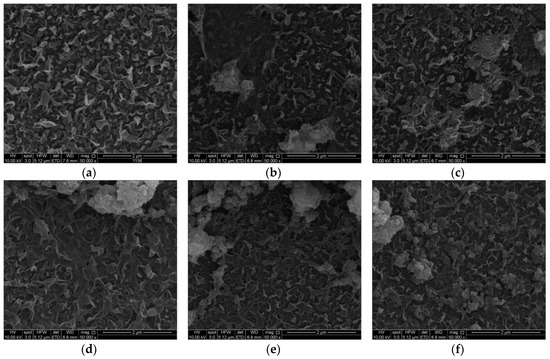 SEM images for membranes surface with MIL-125 NPs injection, (a) 0%, (b) 0.05%, (c) 0.1%, (d) 0.15%, (e) 0.2%, and (f) 0.3%.