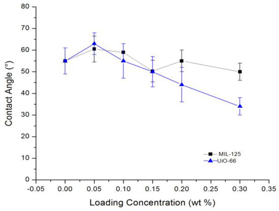 Figure 6 shows the measured contact angles between DI water drop and the membrane’s surface. By adding the MOFs NPs, the contact angle did not decrease significantly. The result is different from filling other nanomaterials such as hydrophilic silica [18] and oxidized graphene [78] where significant decreases of contact angle were observed. This may be attributed to the MOFs structure, which contains organic linkers surrounding the metal core. The organic part is slightly hydrophobic, leading to decreased particle hydrophilicity [38]. From the figure, the UiO-66 had more hydrophilic effect than MIL-125. This could be because MIL-125 has more linkers on the surface shielding the metal atom. The observation is also in consistence with the fact that MIL-125 had a higher surface area.