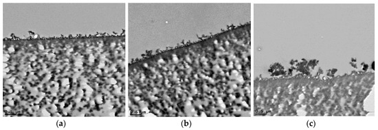 TEM cross section images for the plain membrane and UiO-66 and MIL-125 nanocomposite membranes are illustrated in Figure 7a–c, respectively. Figure 7b is the cross-sectional view of TFN membrane at an optimal UiO-66 NPs loading (0.15%); while Figure 7c is at an optimal MIL-125 NPs loading (0.3%). The TEM examination showed that the particles were filled into the membranes and appeared as black clusters; MIL-125 NPs were highly homogenized with the membrane and affected its texture. From the images, the membrane thickness is found to be 200–400 nm.
