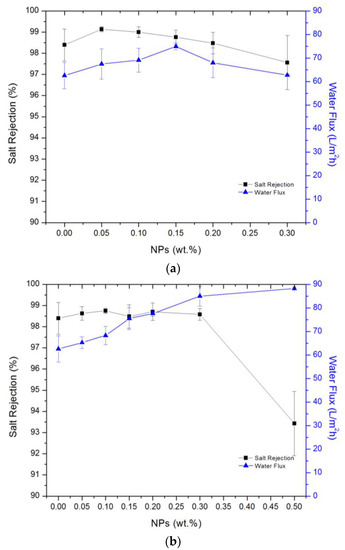 The salt rejection and water flux for UiO-66 and MIL-125 modified membranes were documented in Figure 8a,b. For UiO-66, the optimal addition was 0.15%, where the permeate water flux and salt rejection increased from 62.5 L/m2 h and 98.4% to 74.9 L/m2 h and 98.8%, respectively. From Figure 8a, adding UiO-66 NPs increased NaCl rejection at low loadings, but a further increase of the NPs resulted in a decrease of salt rejection. The rejection increase at low loading could be attributed to UiO-66’s pore size (∼6.0 Å) [59], which is larger than water molecule (~2.8 Å) but smaller than the hydrated ions (Na+ = 7.16 and Cl− = 6.64 Å) [79]. Increasing the NPs amount too much could decrease salt rejection, as the particles aggregation may generate cracks in TFN membranes structure. On the other hand, the flux increase by adding NPs reached its maximum at 0.15%. This is likely due to the hydrophilic nature of UiO-66 [59,80]. At percentages higher than 0.15%, the water flux decreased, again likely due to NPs aggregation [13]. Here, both salt rejection and water flux decreased because of particle aggregation. Aggregation may have created micro gaps between particle blocs that allowed the saline water to pass through. The particle aggregates could also block the water transfer through the membrane by the hydrophobic linkers overlapping, thus decreased water flux. Thereby, reduction in both salt rejection and water flux occurred.