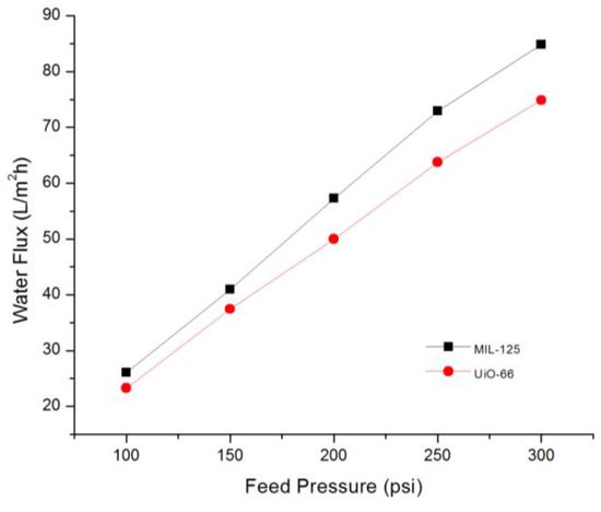 Figure 8b shows the effect of adding MIL-125 NPs to TFN membrane. The water flux increased by increasing NPs loading, for example, with a solid loading of 0.3%, the permeate water flux was increased from 62.5 to 85.0 L/m2 h, while the salt rejection maintained almost the same (98.4% vs. 98.6%). At filling of 0.5% NPs, a drop in salt rejection happened. The effective pore diameter of MIL-125 is 12.55 Å [60] which is larger than both the water molecule and hydrated ions of Na+ and Cl−. However, the salt rejection remained the same even at a higher loading, the high negative charge of MIL-125 could play a role here as the formed electrical double layer could repel the negatively-charged ions. The reported water flux here at 0.3%, 85.0 L/m2 h, is considered one of the highest in comparison with the reported values in the literature [81]. The high flux could be due to the NPs hydrophilicity and their large surface area and pore size. Figure 9 shows the permeability of optimal membranes by adding 0.15 wt % of UiO-66 or 0.3 wt % MIL-125 at different feed pressures.