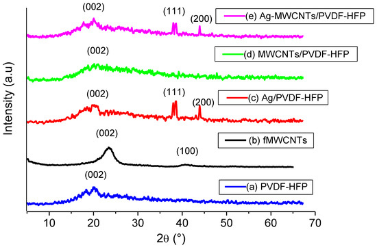 X-ray diffraction patterns of (a) poly(vinylidene fluoride-co-hexafluoropropene) (PVDF-HFP), (b) fMWCNTs, (c) Ag/PVDF-HFP, (d) MWCNTs/PVDF-HFP, (e) Ag-MWCNTs/PVDF-HFP.